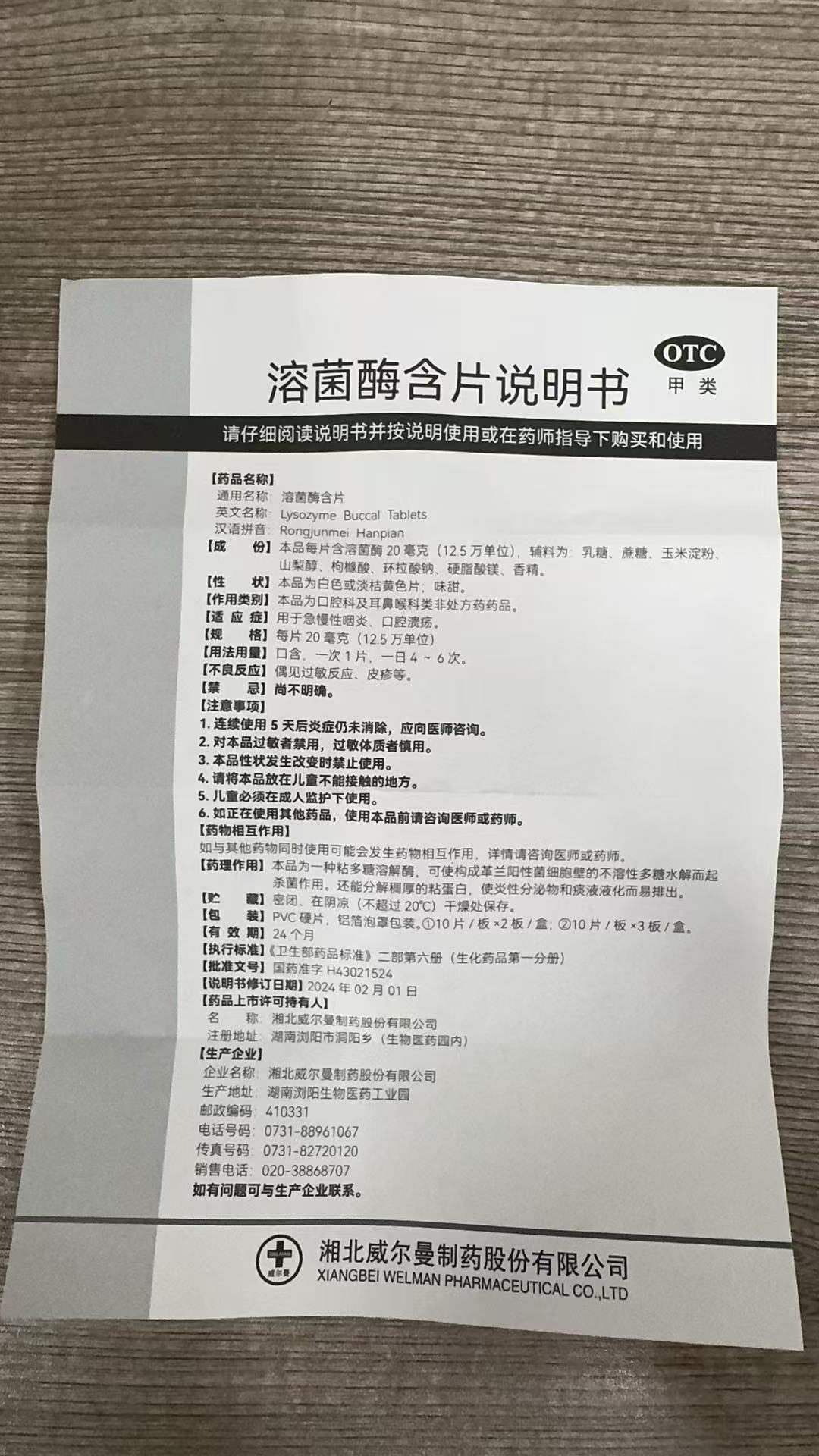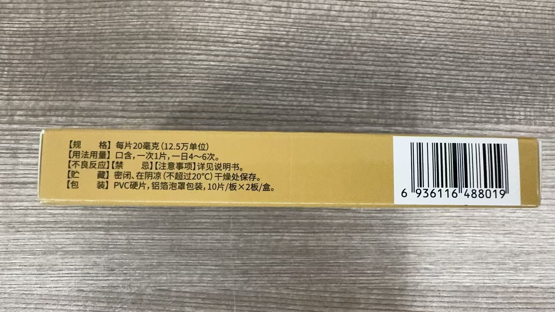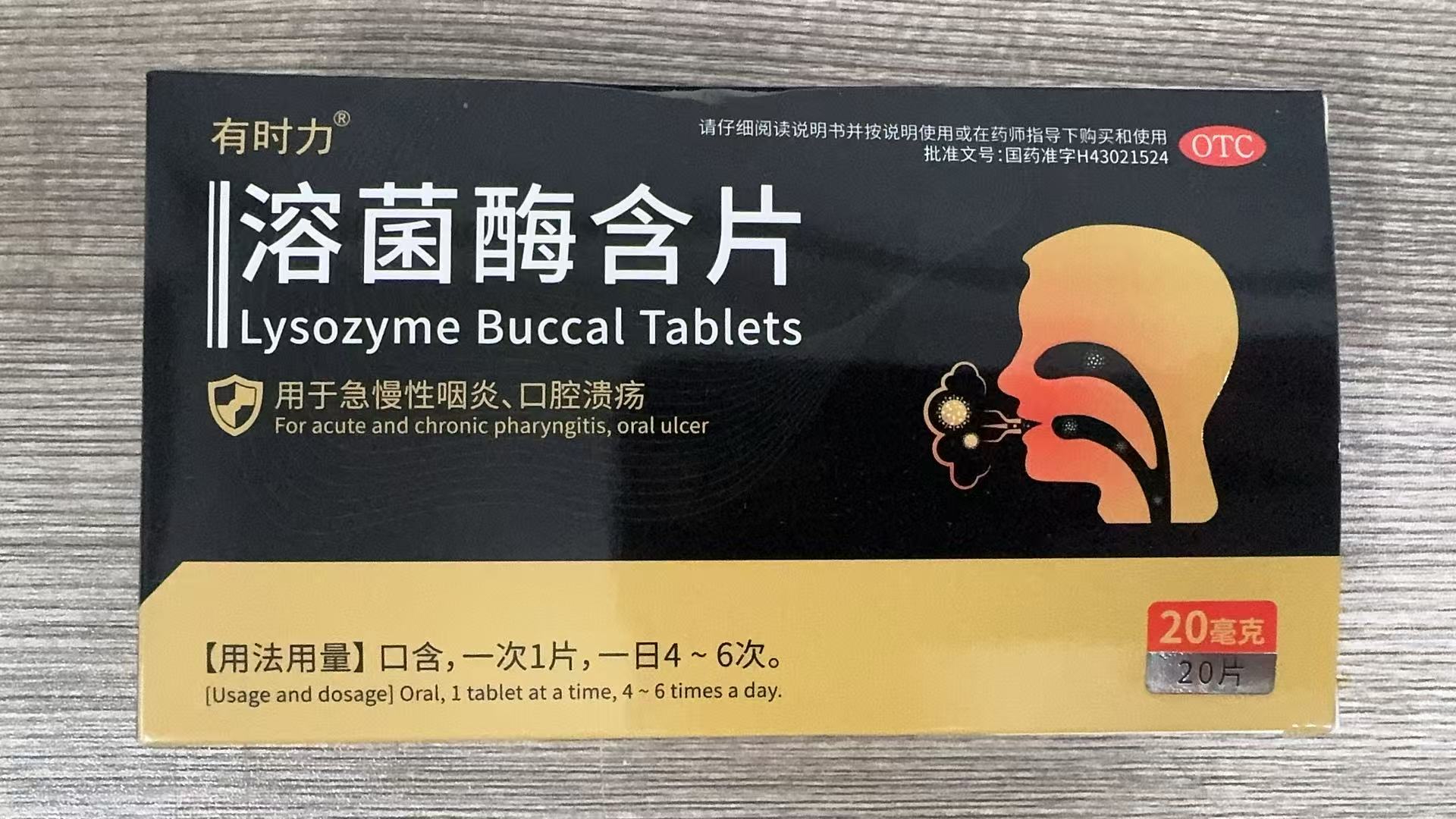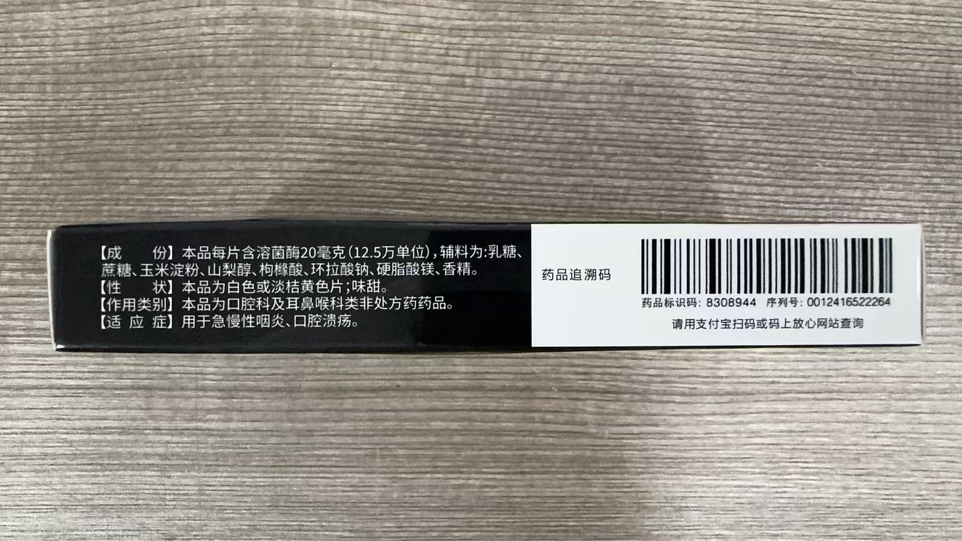 本品每片含溶菌酶20毫克(12.5万单位),辅料为:乳糖、蔗糖、玉米淀粉、山梨醇、枸橼酸、环拉酸钠、硬脂酸镁、香精
